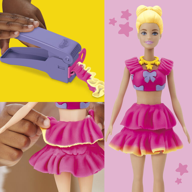 Create super cute styles with the Ruffles and Bows set! It's easy and fun to make Play-Doh Barbie doll clothing with this arts and crafts kit. Just place the doll on the stand, use the Play-Doh Pattern sheet and cutters to cut Barbie dresses, and dress her up in the most creative ways imaginable. Give her different Play-Doh hairstyles with the hair mold or kids can make their own by hand. Add Barbie doll accessories like a purse and shoes to complete her look. Keep the imaginative play going with 2 cans of Play-Doh modeling compound to add even more details. Give a fabulously fashionable gift for kids who love Barbie playsets and Play-Doh toys! Copyright 2025 Mattel. PLAY-DOH and HASBRO and all related trademarks and logos are trademarks of Hasbro, Inc.